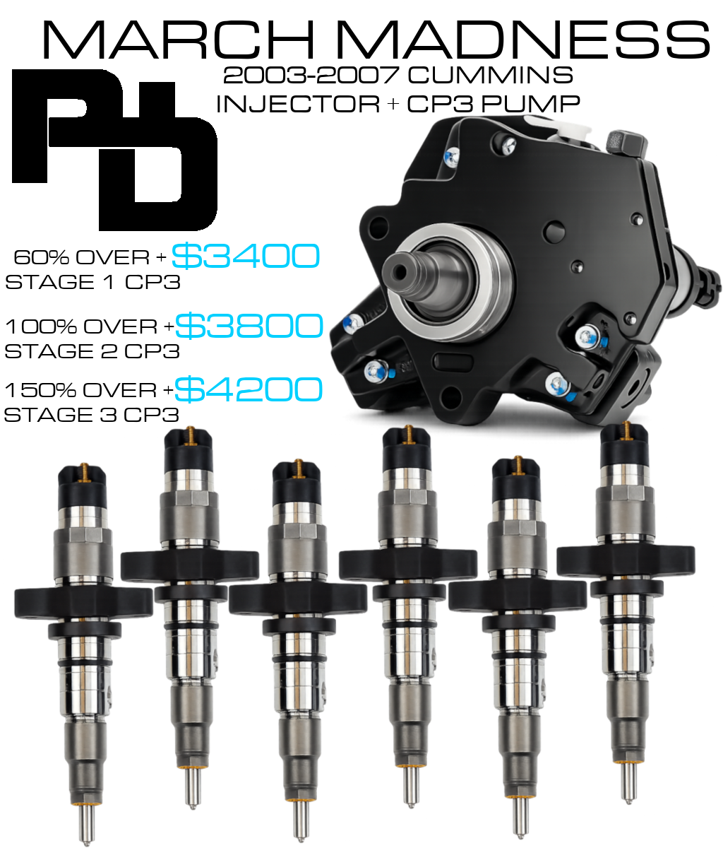 FOR MARCH MADNESS THIS HUGE SALE WILL INCLUDE 2003-2007 6.7 CUMMINS INJECTORS AND PUMP COMBOS 60% OVER W/ STAGE 1 CP3 100% OVER W/ STAGE 2 CP3 150% OVER W/ STAGE 3 CP3